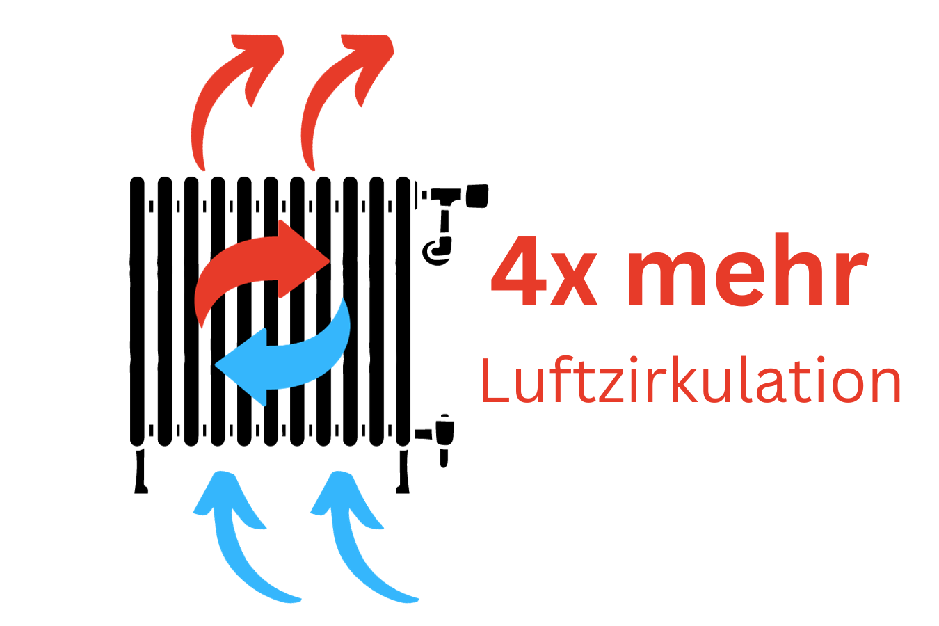 Durch die stark erhöhte Zirkulation ist die Wärmeübertragung von Heizkörper an Raumluft deutlich effizienter und schneller. Außerdem sorgt der Luftstrom für eine gleichmäßigere Verteilung der Wärme.